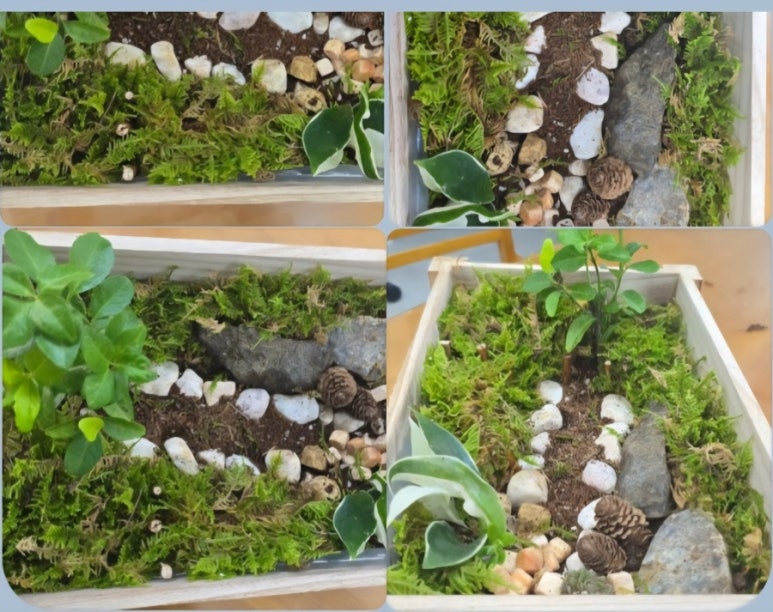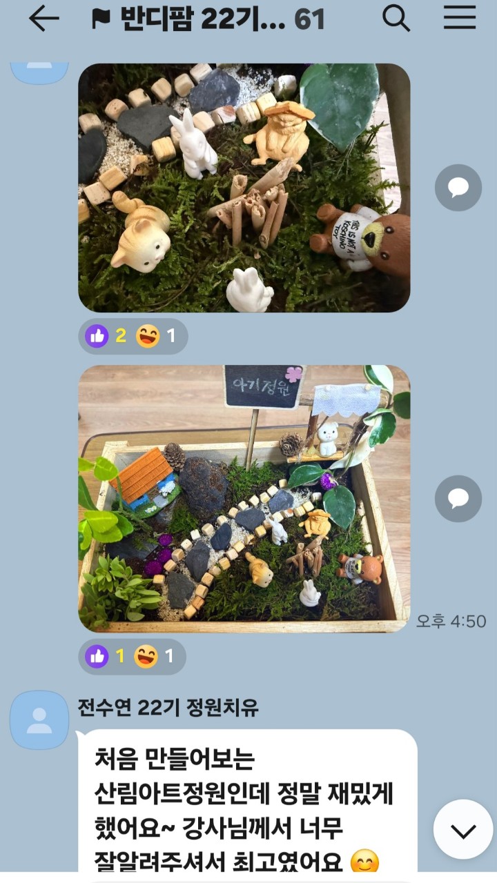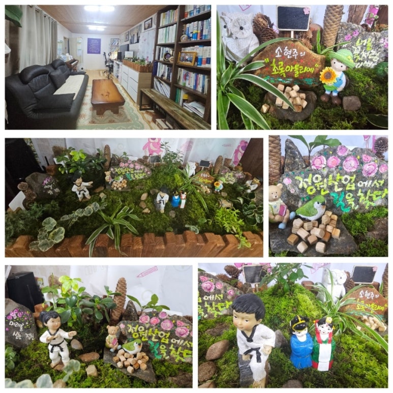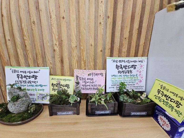워크북까지 만들어 주었더니 자신감 생겼는지 산림아트정원 키트 재료를 계절별로 맞게 준비해 만들어보더니 해볼수록 멋진 작품이 나오니 신이 나는지 반디팜 교육장 한켠이 전시장이 날로 화려 해집니다 .