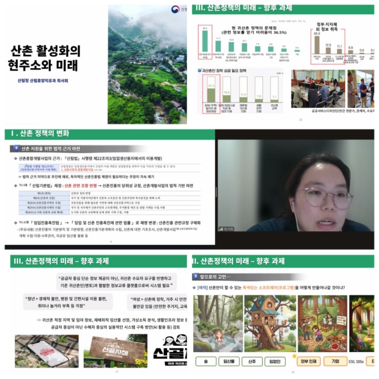 여러 가지 고민한 흔적이 그대로 전해집니다. 산촌만 분리시켰다가 농림부 지원에서 빠질까 걱정이고 그렇다고 농촌속에 포함되있는 산촌이지만 도시민들이 좋아하는 요소가 산촌에