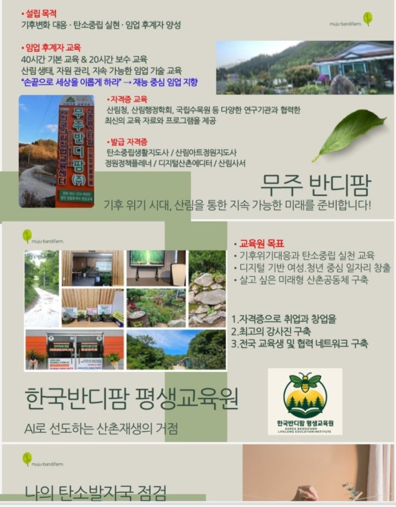 올해 농촌체험 품질 개선 서비스사업에 선정되어 무주반디팜 교육장 리모델링으로 한국반디팜 평생교육원도 인가되어 최고의 성장 기반을 갖추었으니 새해부터는 시대를 선도하는 산림인재를 적극 양성하여 무주군 지원에 보답해야 겠습니다.