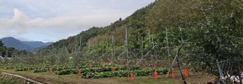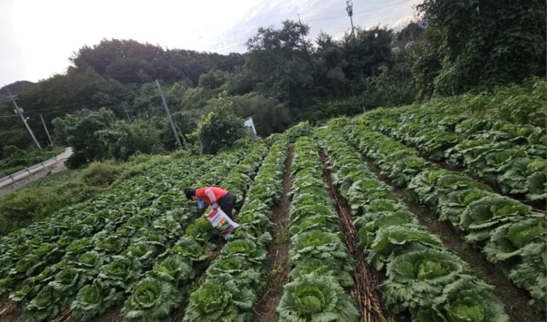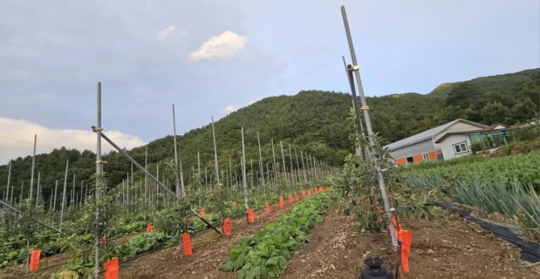 사과나무는 월동을 위해 밑둥에 빨강 옷을 입히고 추석배추도 잘 커가고 있고